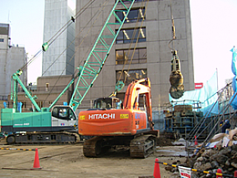 A bottom belling bucket enables expanded pile construction with a capacity of 5 times even at a narrow site.